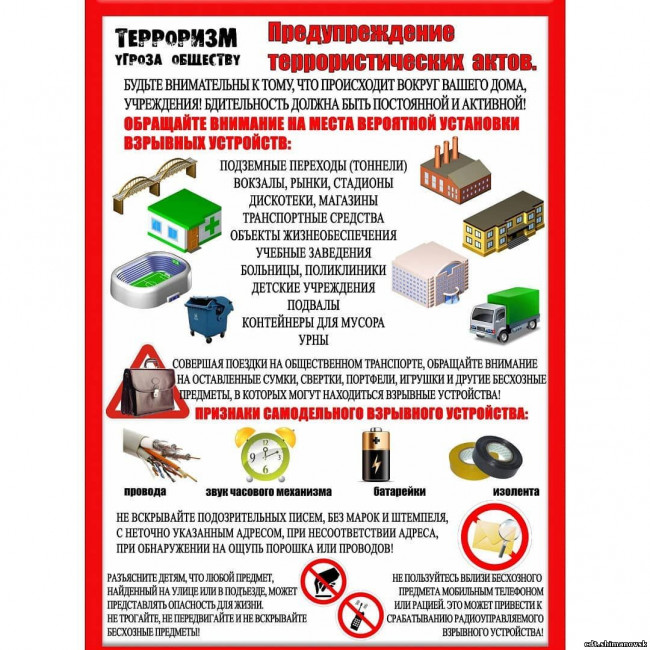 Уважаемые жители, Просим Вас ознокомиться и соблюдать меры по антитеррористической безопасности, быть внимательными и бдительными, довести до сведения детей. Берегите себя и близких.